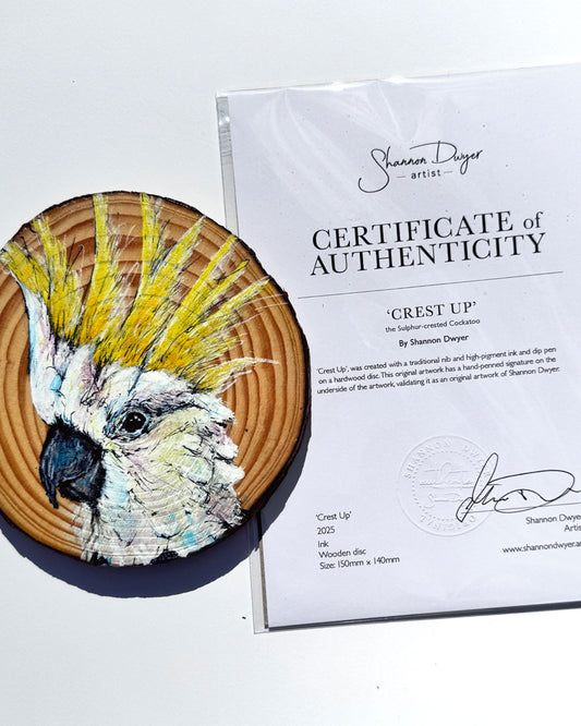 'CREST UP' the Sulphur-Crested Cockatoo - wooden disc