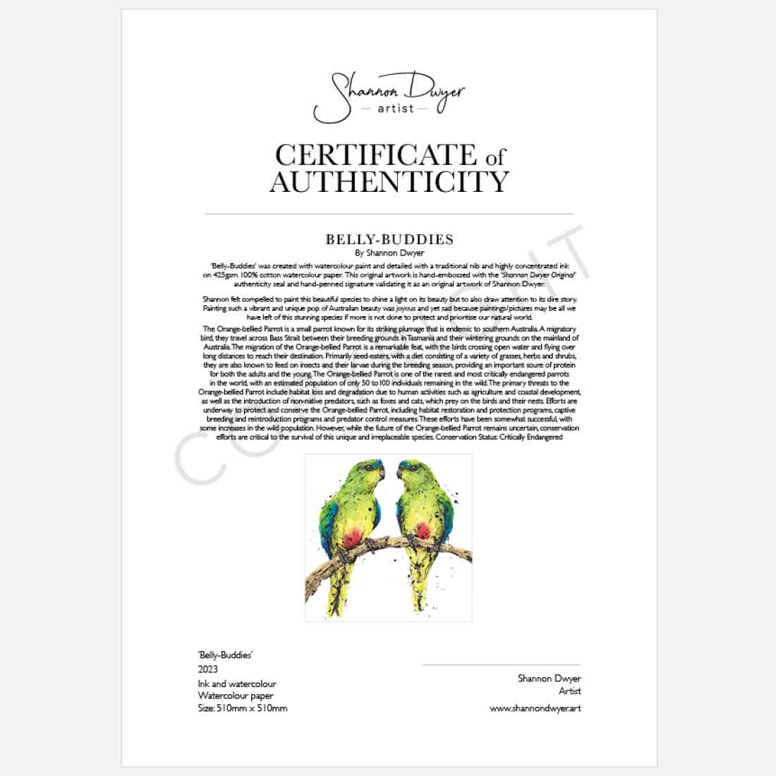 This original artwork is embossed with the ‘Shannon Dwyer Original’ authenticity seal and hand-penned signature validating it as an original artwork of Shannon Dwyer.