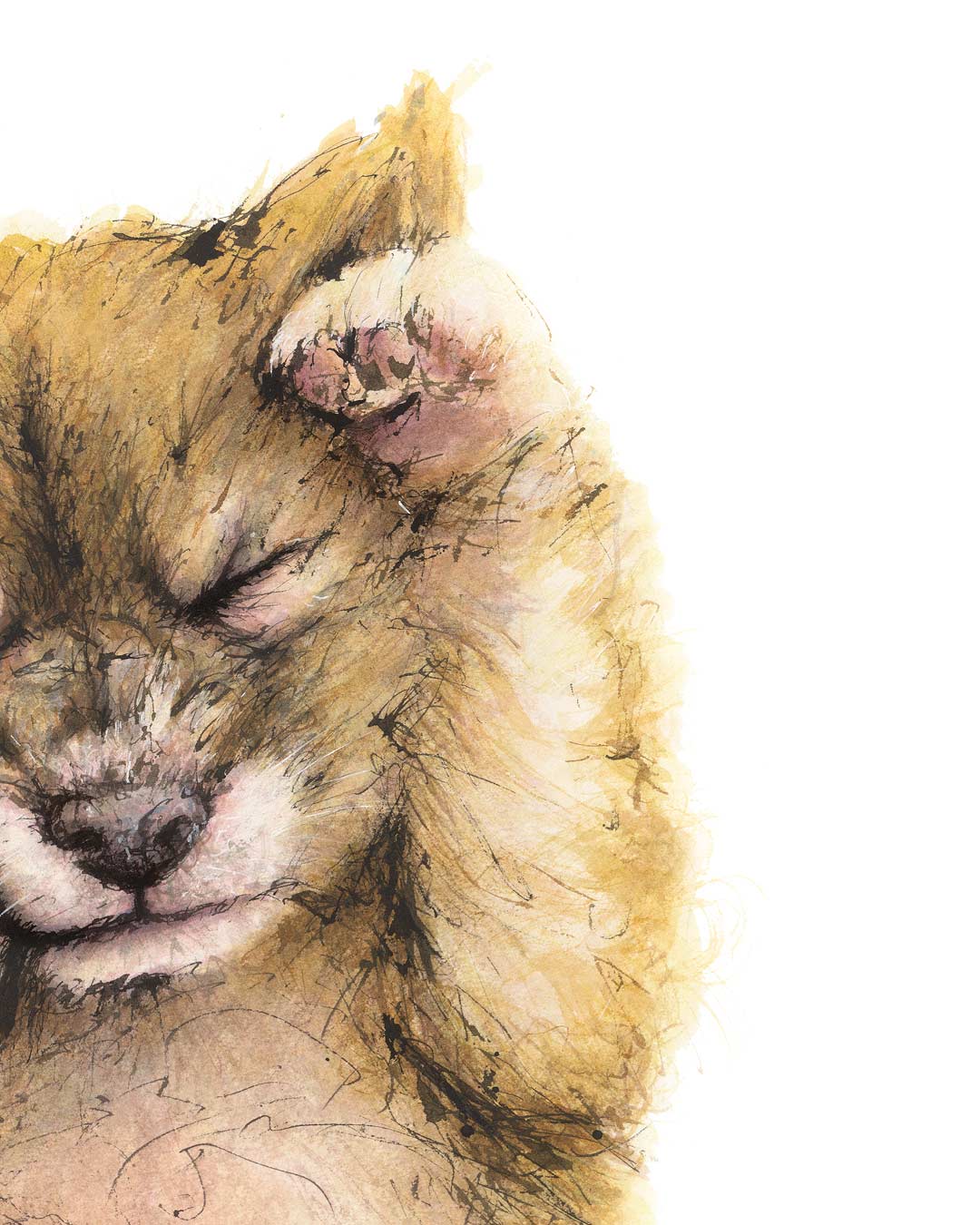 Curled into a soft little bundle, the artwork was created using a mix of watercolours and ink, with warm tones of sandy browns, golds and soft creams layered against gentle washes of purples and blues. These colours echo the dingo’s place in the Australian landscape – both resilient and deeply connected to the land.