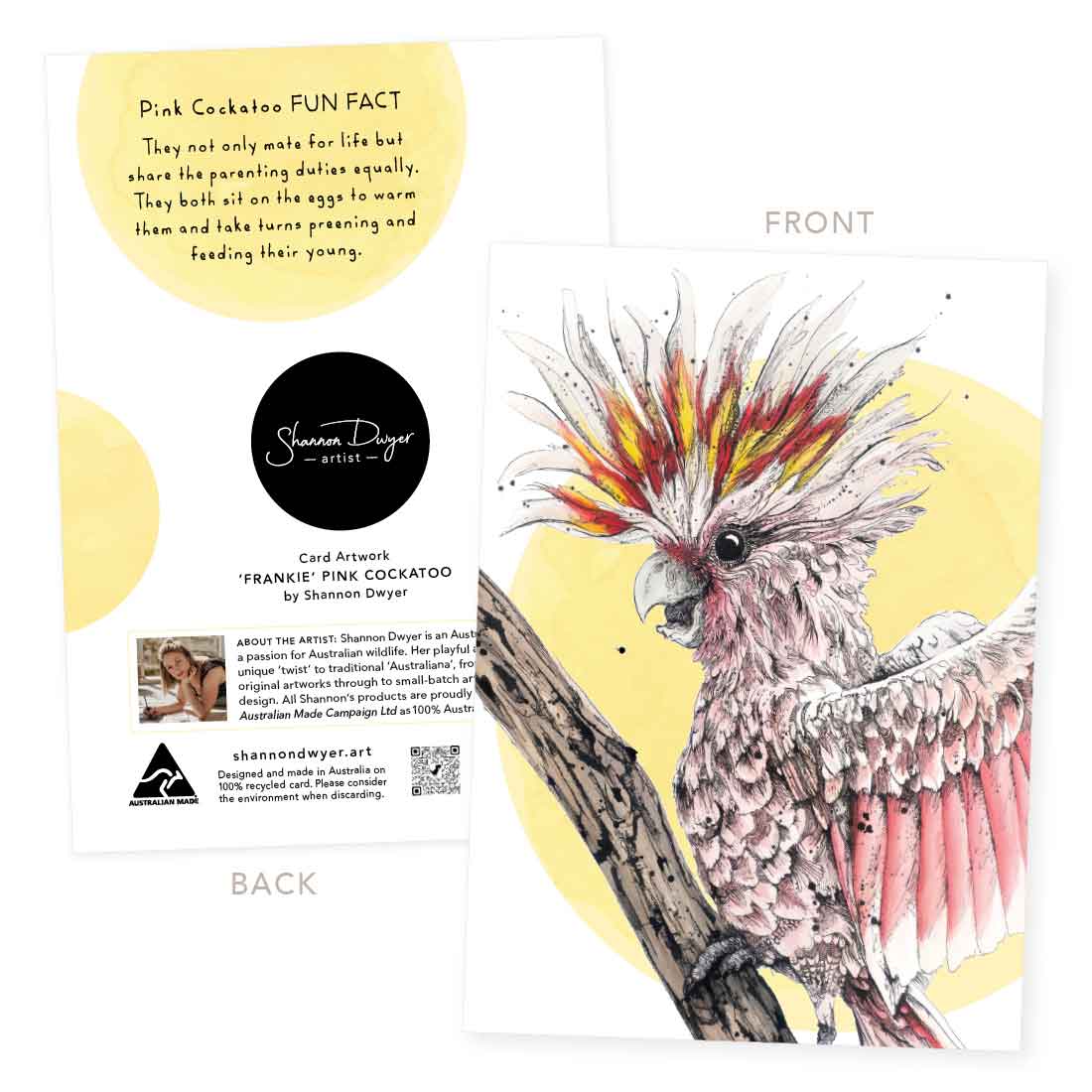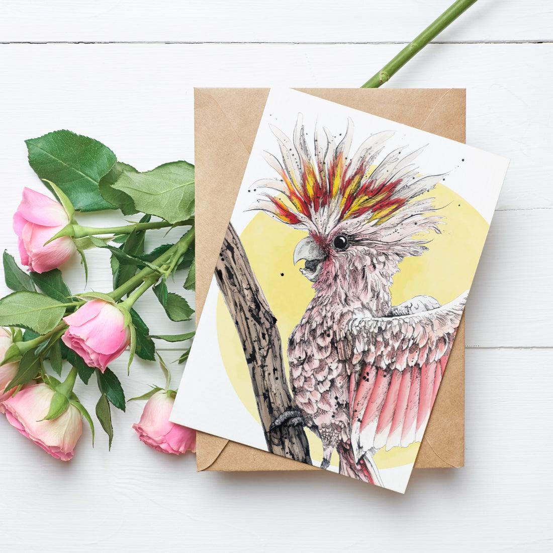 Brighten someone’s day with this deliciously showy Major Mitchell Cockatoo. This artwork captures the bird’s quirky charm and celebrates the beauty of Australia’s natural world. On the back, discover a fun fact about the pink cockatoo, adding an extra touch of delight. Perfect for anyone who appreciates quality, unique art with a fun, Australian twist!