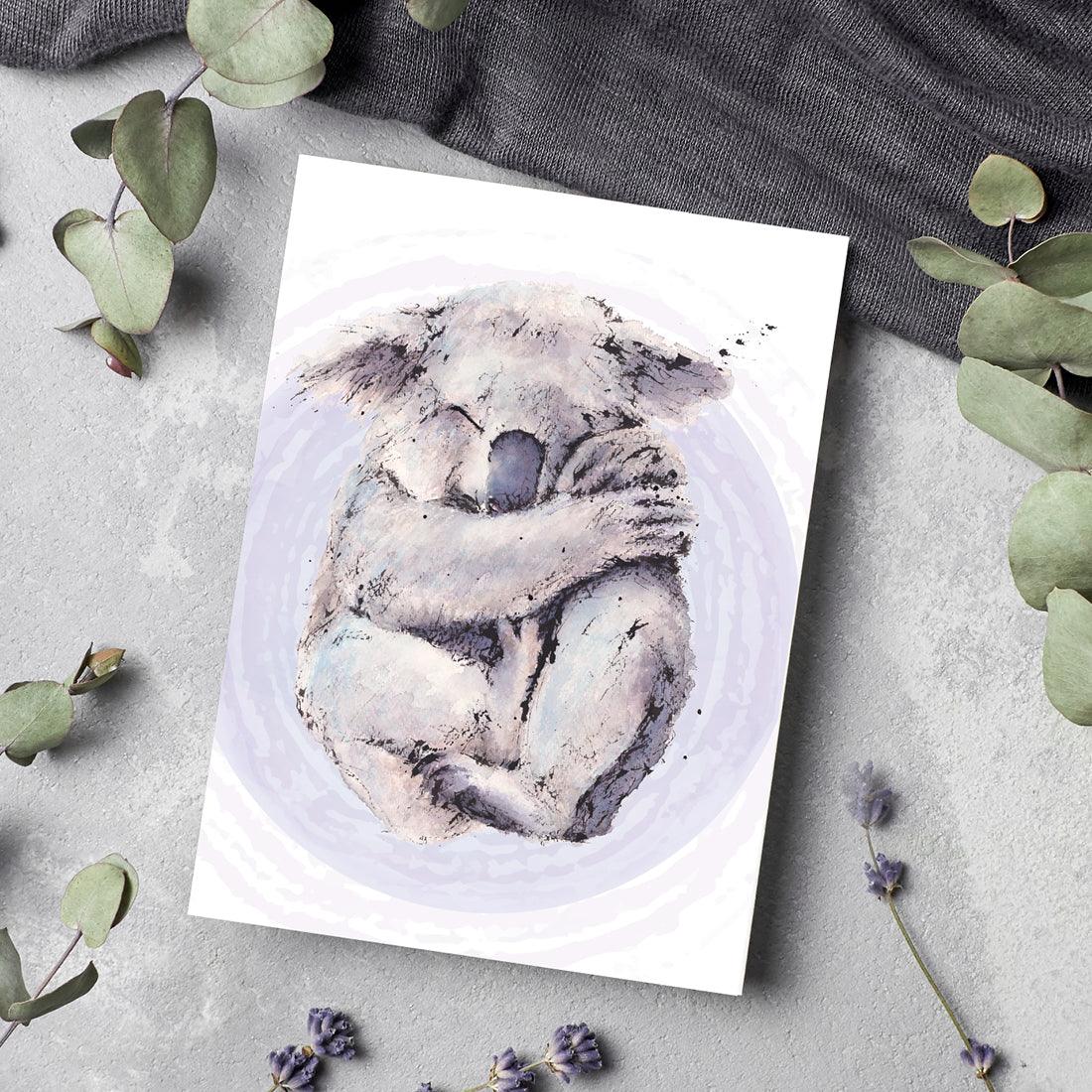 This sleepy little nuzzling ball of fuzz will bring joy to all that behold it! Send a message of tranquility with this charming greeting card featuring a peaceful, sleeping koala. The beautifully detailed artwork captures the serene beauty of Australia’s most iconic animal. A fun fact about the koala on the back adds an extra layer of delight, perfect for anyone who loves quality, unique art and the natural world of Australia.