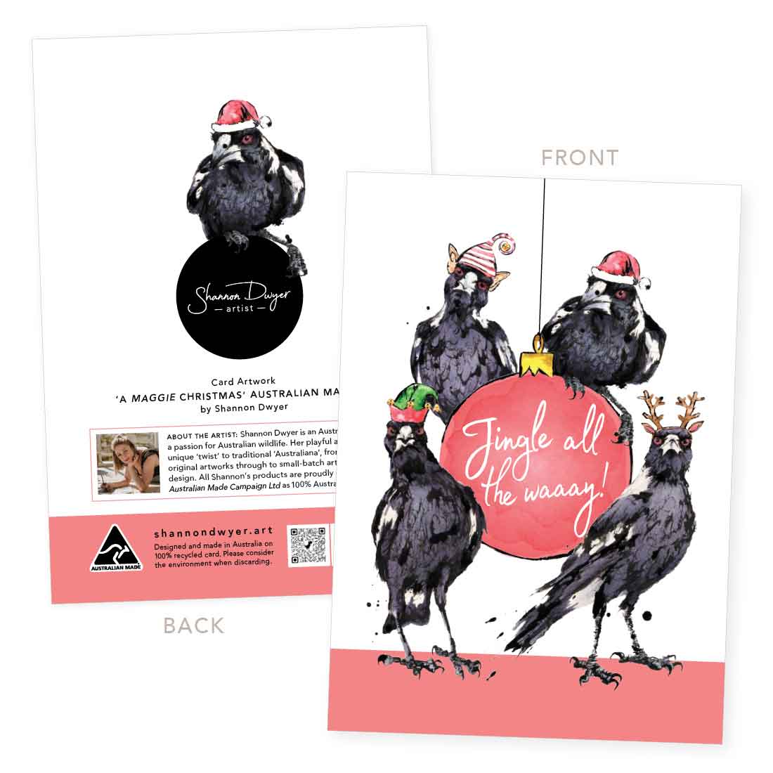 Each card showcases a unique, quirky artwork of Australian artist Shannon Dwyer whose distinctive style of watercolour and ink, brings the animals to life with vibrant colours and whimsical character.
