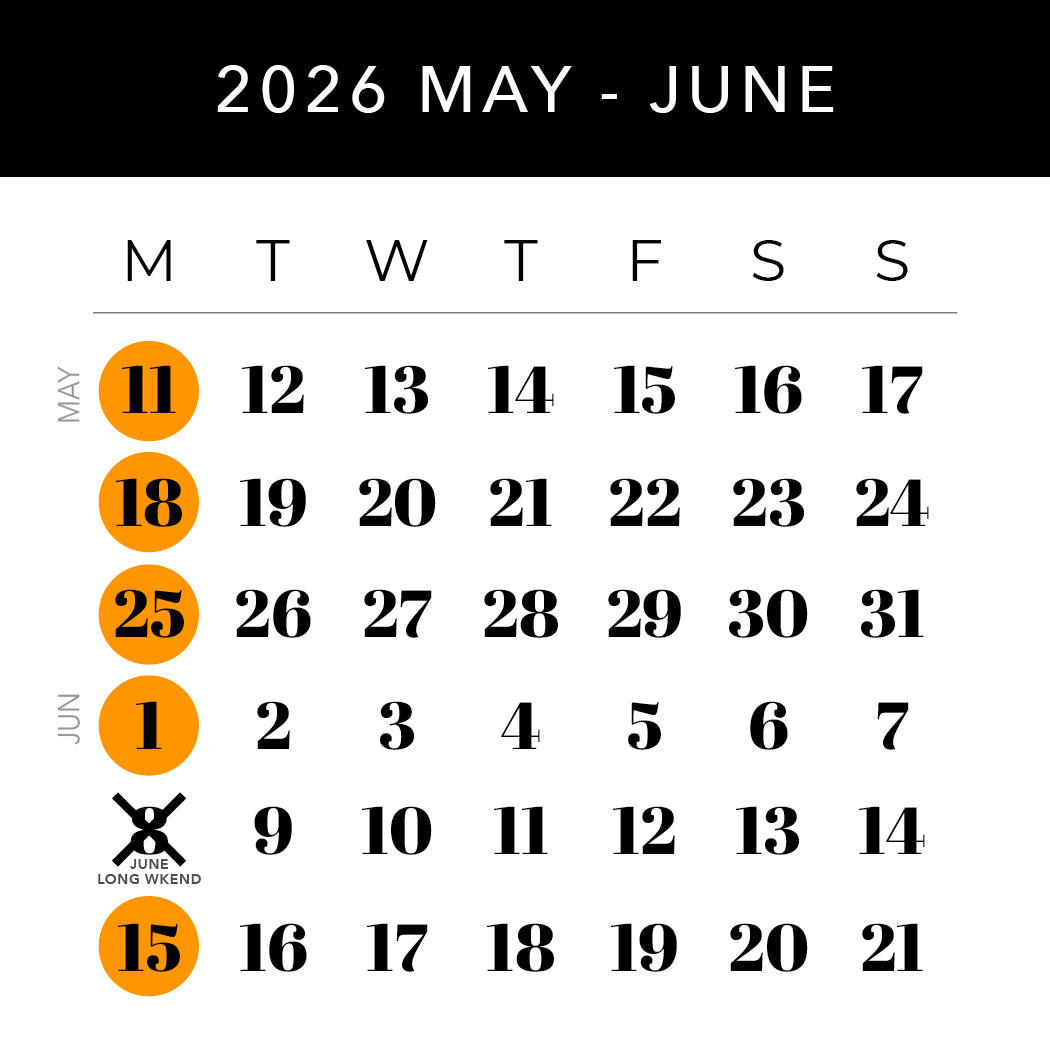 11, 18, 25 May, 1 & 15 June* (no class on pub. hol. 8 Jun).