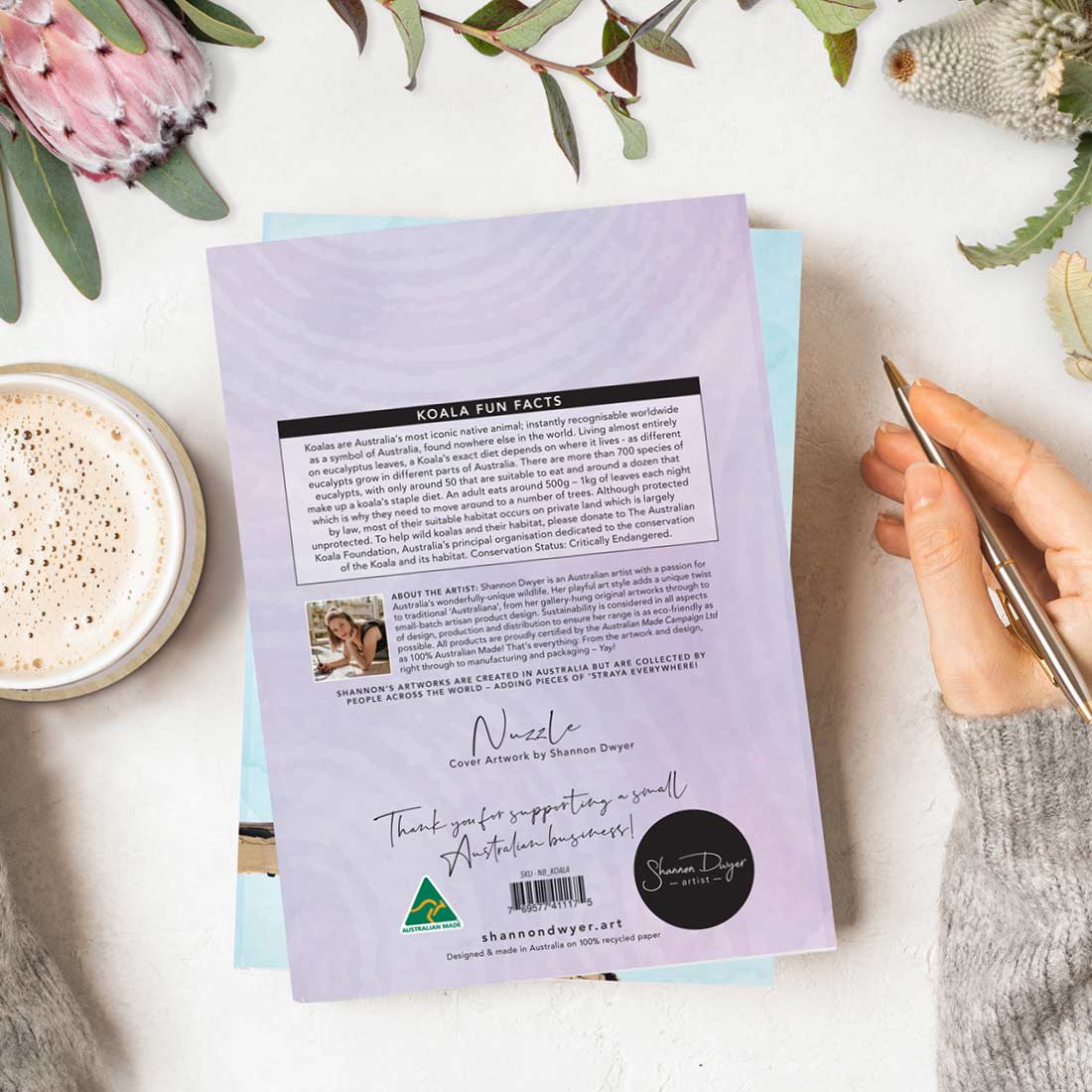 'Nuzzle' the Koala is the featured artwork on this super-luxe notebook by Shannon Dwyer Artist. Filled with 80 pages of thick, premium paper - stationery has never been so dang sexy!