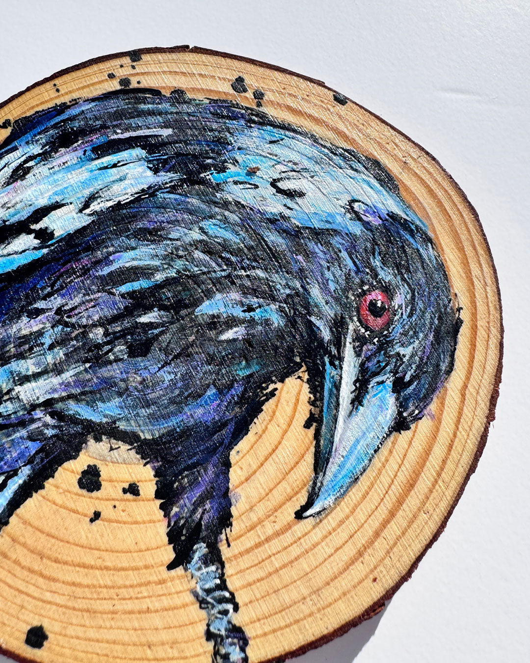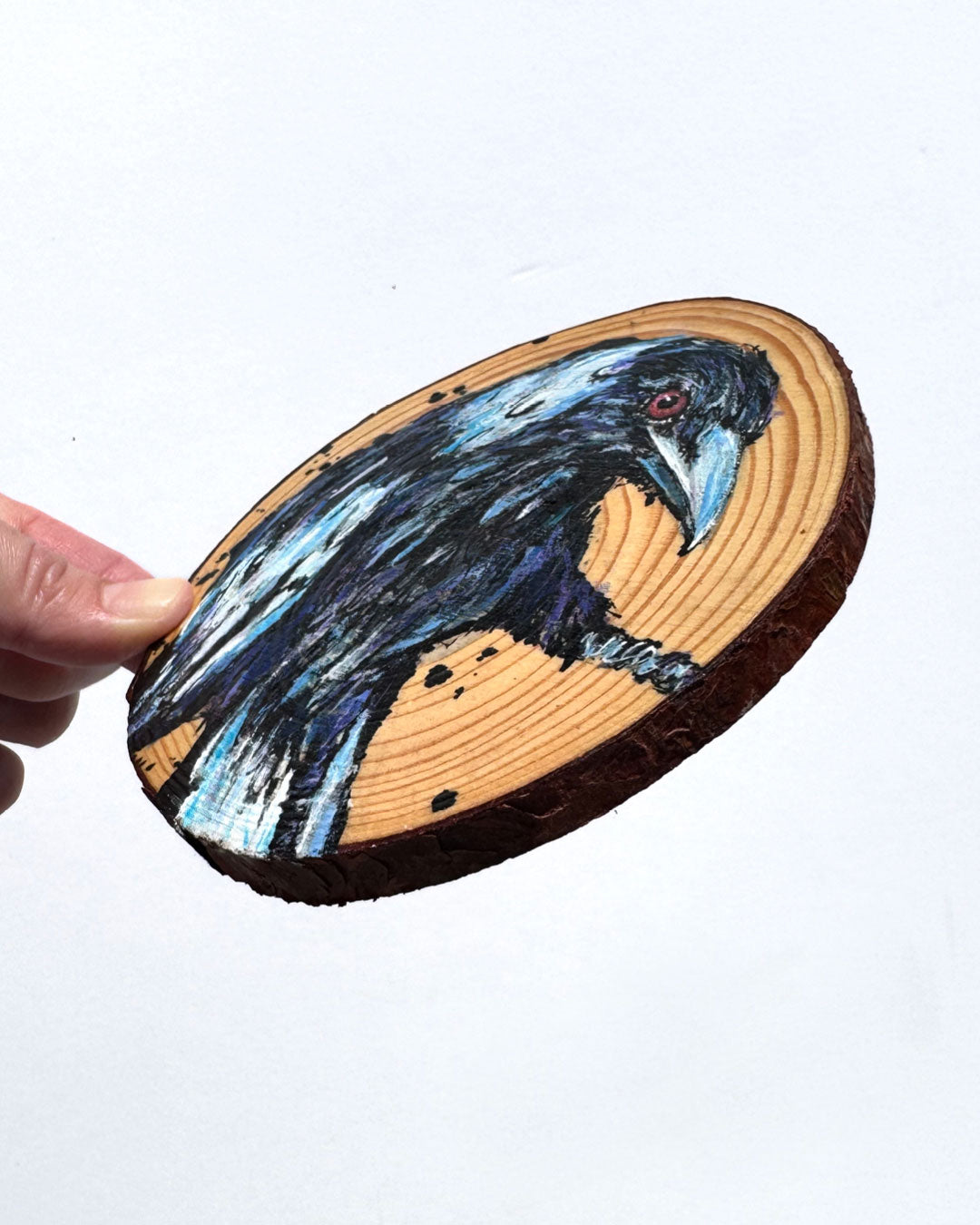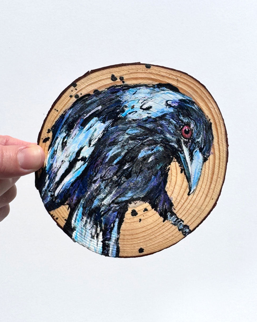 Painting this little Australian Magpie with its serious, no-nonsense stare was pure joy for me – I’m completely obsessed with magpies and this one felt especially piercing. There’s a quiet intensity in the way they watch the world and I enjoyed every experimental brushstroke when creating this wooden art piece.