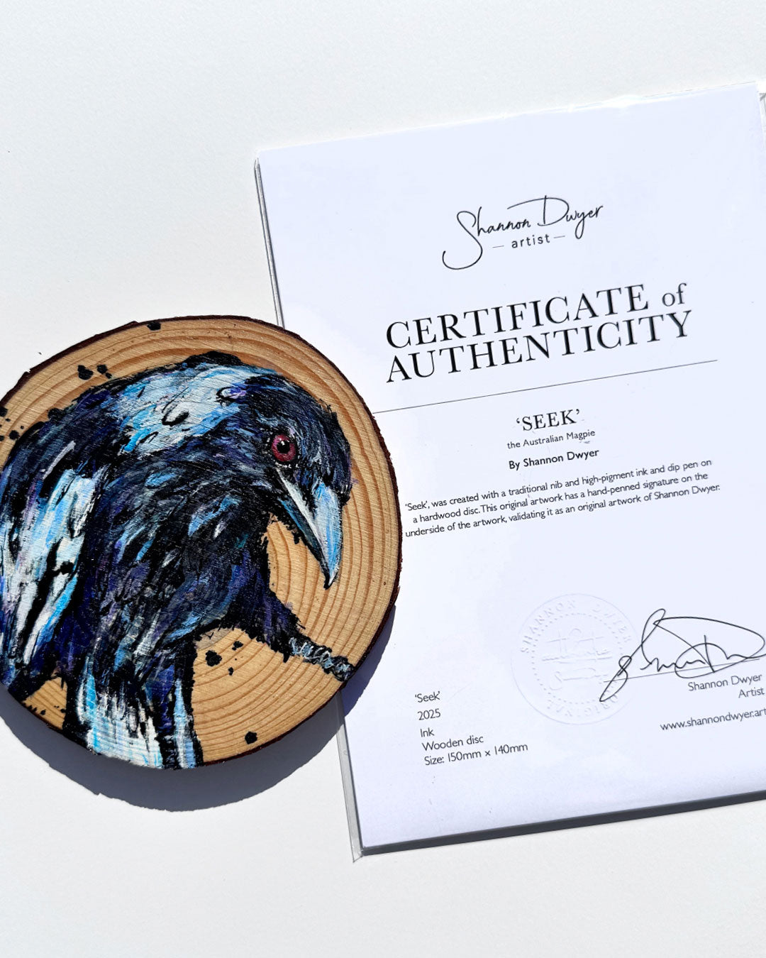Artwork is also accompanied by a signed Certificate of Authenticity which has also been embossed with the ‘Shannon Dwyer Original’ authenticity seal and hand-penned signature validating it as an original artwork of Shannon Dwyer.